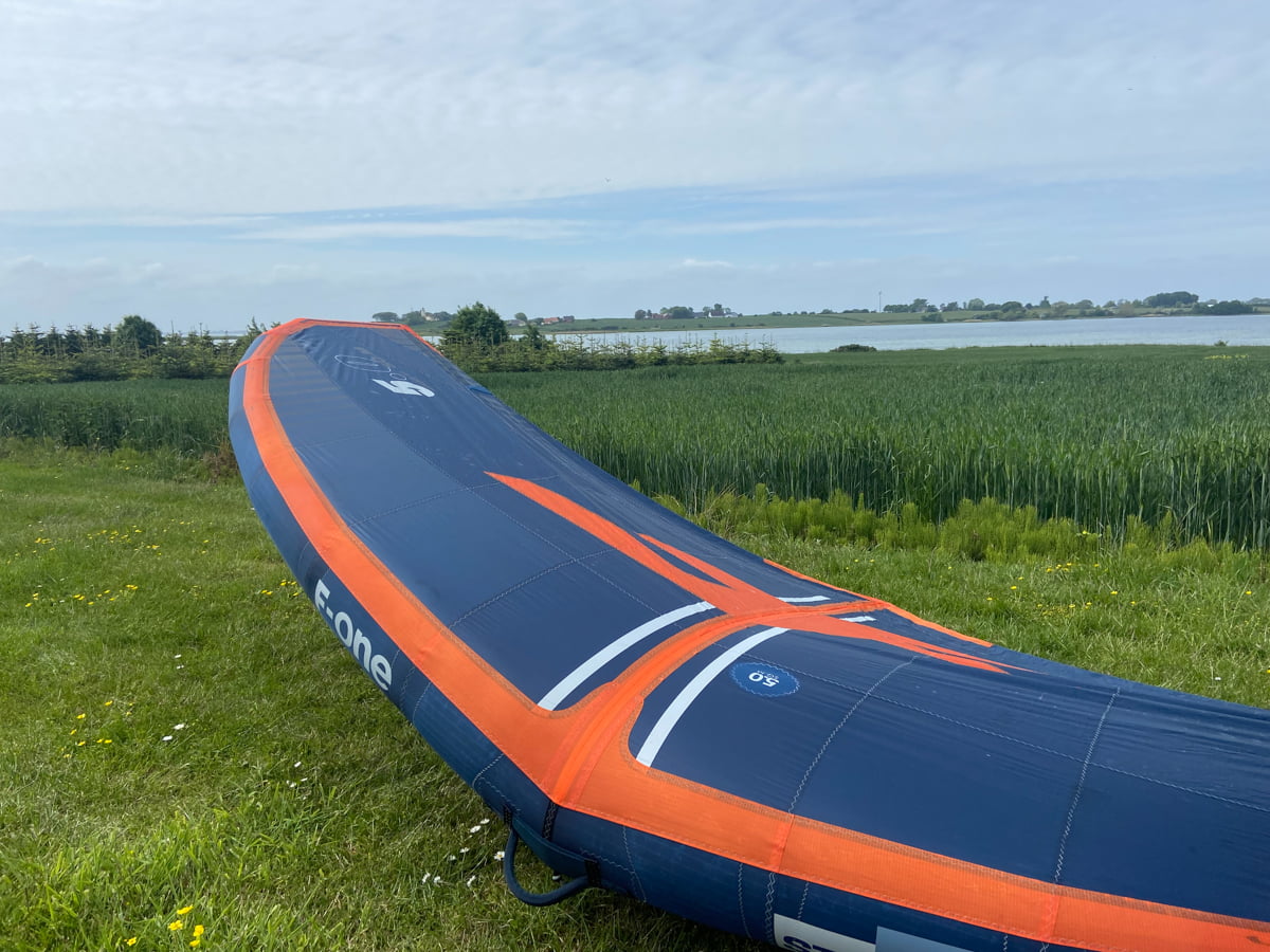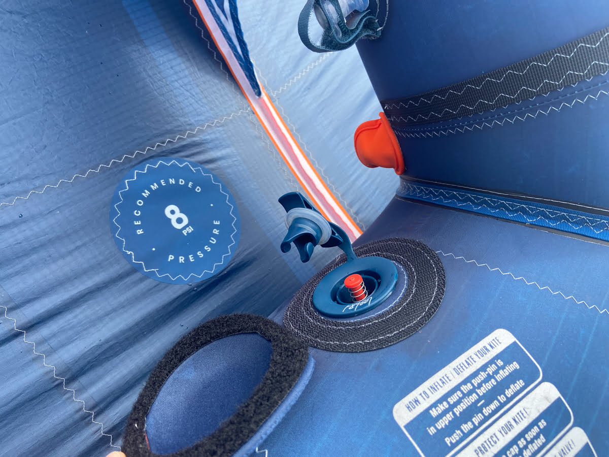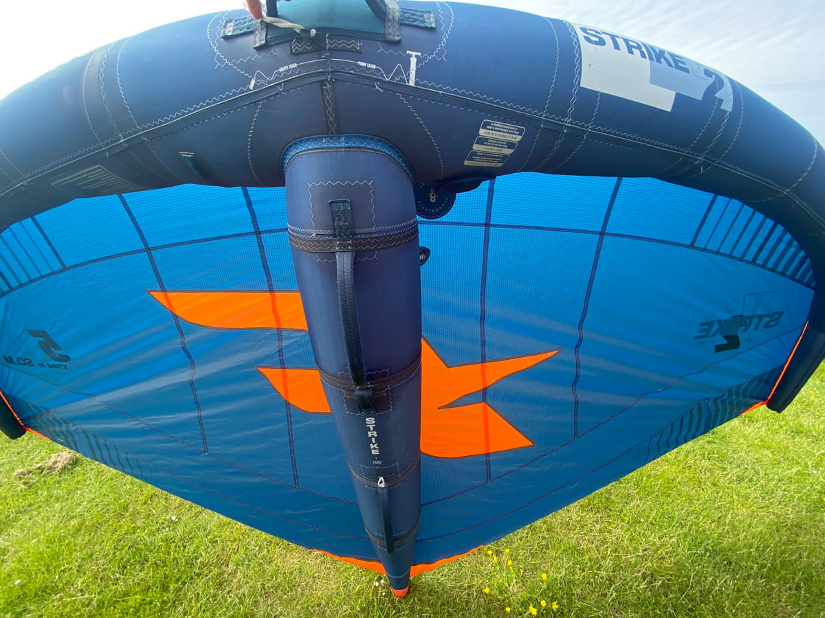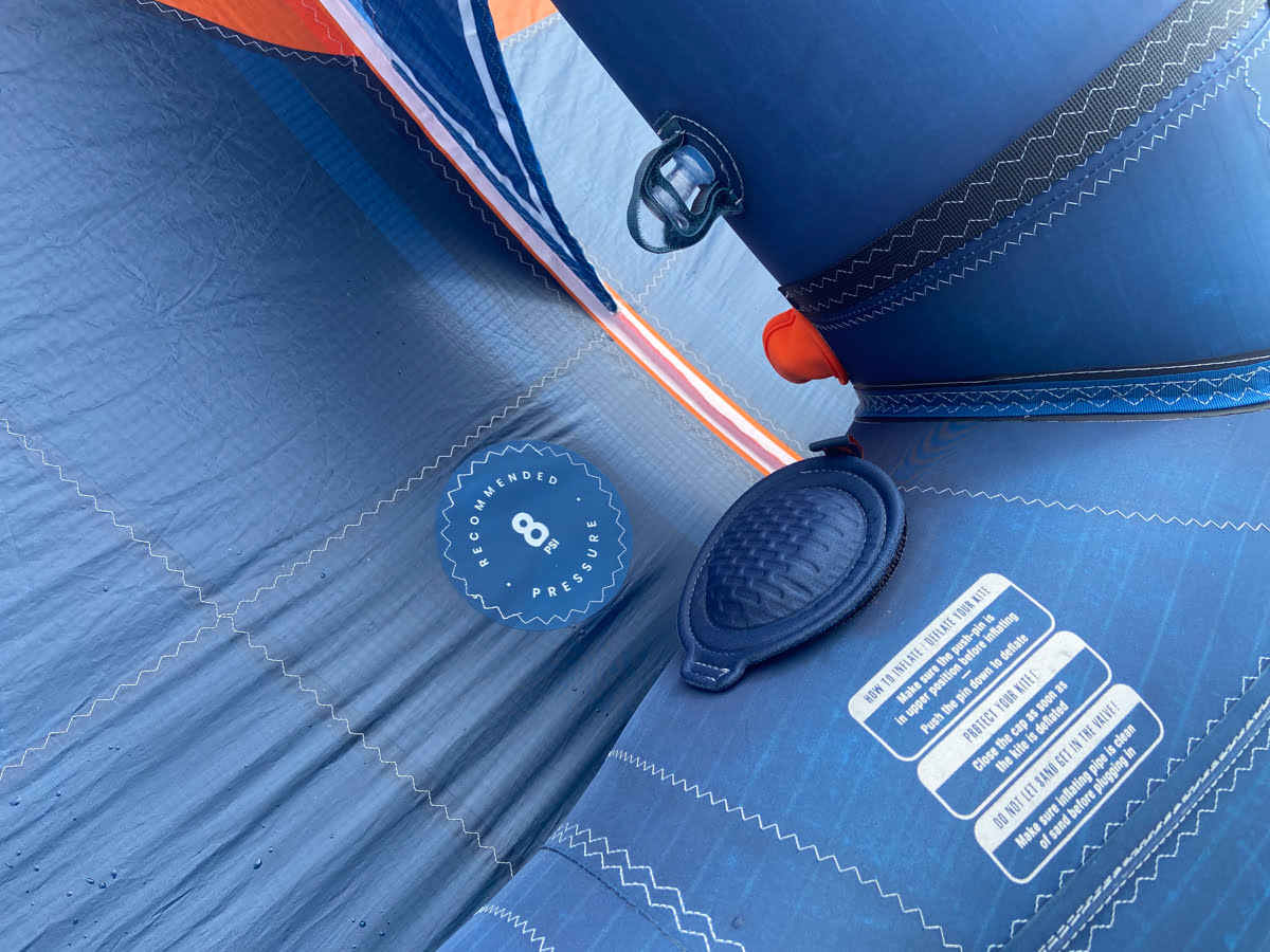 Einmal aufgepumpt fallen direkt weitere Merkmale des F-One Strike V2 auf. In klug gewählten Bereichen findet man Verstärkungen gegen Abrieb und die Abrisskante ist an einigen Bereichen ebenfalls verstärkt. Das gesamte Setup wirkt straff, das Flugtuch ist schön gespannt. Die Nähte sind alle sauber verarbeitet, hier gibt es nichts zu beanstanden. Für mehr Komfort bei viel Wind kann der Wing mit 0,5 PSI weniger aufgepumpt werden, was aber nicht bedeutet, dass sich der F-ONE Strike V2 bei Böen ruppig verhält, ganz im Gegenteil! Hierzu aber später mehr.