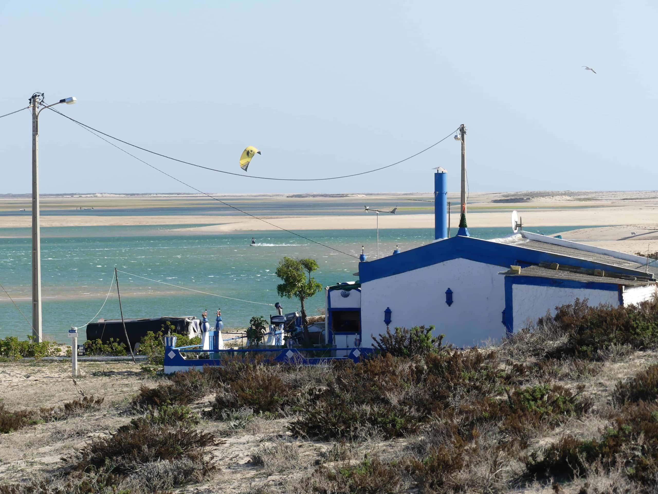 Der Spot befindet sich im Naturpark Ria Farmosa, weshalb sehr auf die dort lebenden Tiere und die Natur geachtet werden muss. Durch vorgelagerte Sandbänke erstreckt sich eine weitläufige Flachwasserlagune, die bei high-tide komplett voll läuft, aber auch bei low-tide noch genug Wasser zum Kiten bietet. Der Spot funktioniert theoretisch bei allen Windrichtungen. Während wir dort waren, kam der Wind ausschließlich aus östlichen Richtungen (Levante). Wir hatten von 20 Tagen insgesamt an 5 Tagen ausreichend Wind zum Kiten.